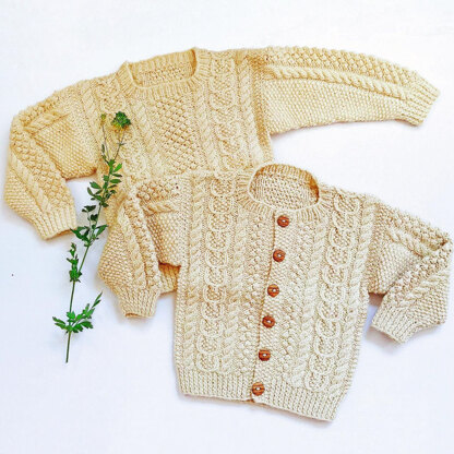 Yankee Knitter Designs Child’s Aran Sweaters are such fun to knit as the cables and patterns on this pullover and cardigan are worked on the same rows, so it is easy to keep track of your work. The sweaters are knit in worsted weight yarn from the bottom up in pieces and then seamed. The cable pattern is in written form only.