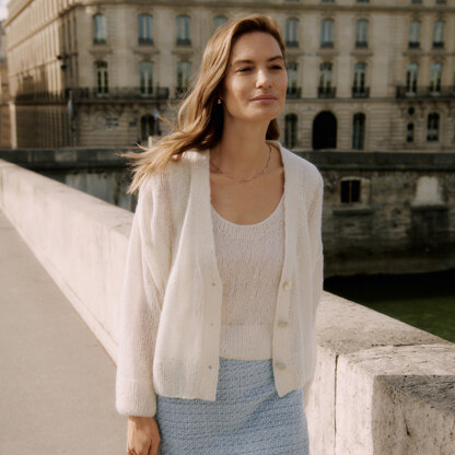 The Lana Grossa Twinset in Bella is a beautifully updated take on the classic tank and cardigan set. With a scoopneck tank and a v-neck dropped shoulder cardigan, this chic set has a timeless style that will effortlessly slide into your wardrobe. Both pieces are knit flat in pieces from the bottom up and seamed. Lana Grossa Bella is a fluffy blend of cotton, baby alpaca, nylon, and wool that works up into lightweight garments and accessories.