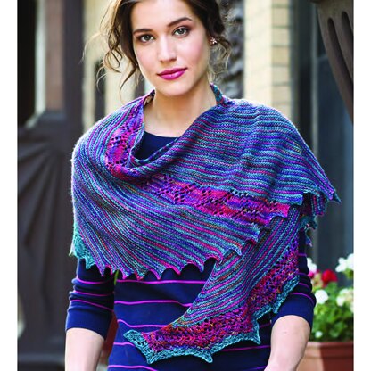 Knit in two gorgeous colors of Malabrigo Mechita, Bleeker is a striped and generously sized asymmetrical shawl. Lace patterns break up the striping, and a stair-stepped edge along one side adds interest.