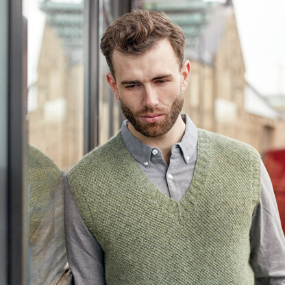 Rowan Dean is a V-neck vest showcasing a textured pattern that shows off this rustic looking yarn perfectly. This garment is designed by Martin Storey and knit in Rowan Felted Tweed a soft DK weight blend of Merino, alpaca, and rayon.