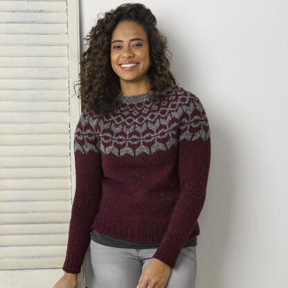 Knit in worsted weight Donegal Tweed, Tahki Yarns Lavina Pullover is a stranded women’s sweater knit seamlessly in the round from the top down. With so many colors of Donegal Tweed to choose from, the color combinations are endless! Note: Colorwork pattern is charted only.