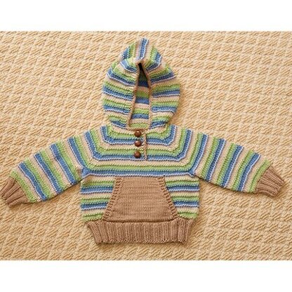 In the Striped Hoodie & Hat pattern from Tahki Yarns, ridged stripes in colorful Cotton Classic yarn create a comfy hoodie for baby, and a matching hat to boot. Knitting in the round makes for a simpler finishing process; hoodie body and sleeves are knit in the round to the underarm, where they join to work the yoke in one piece. hat is knit in the round from brim to crown.